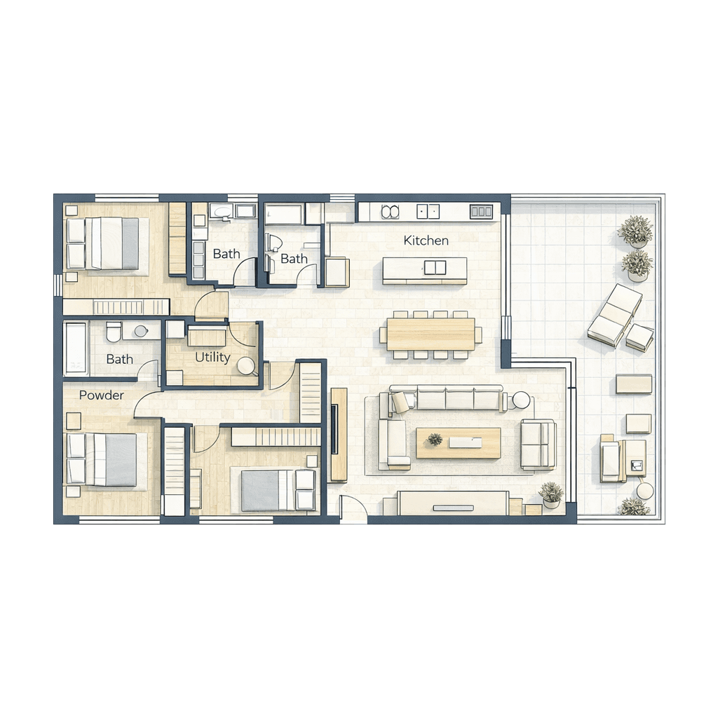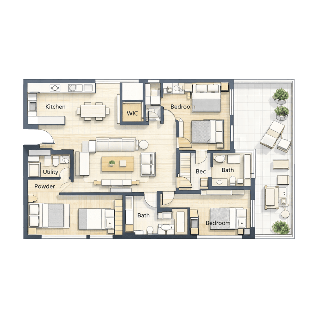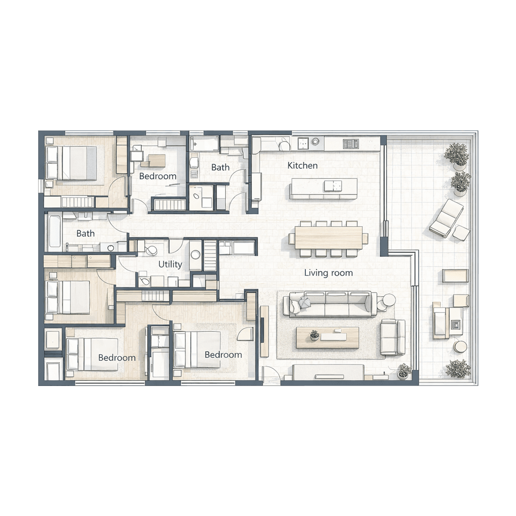 Explore a selection of refined penthouse floor plans, carefully designed to balance generous living spaces, privacy, and seamless flow across every residence.
